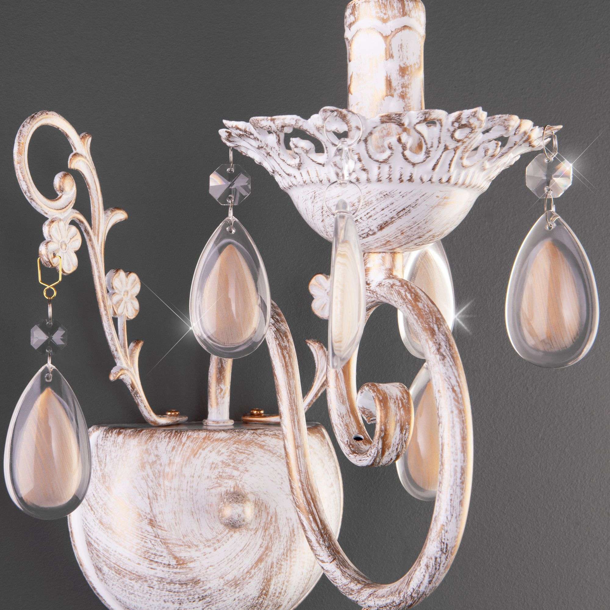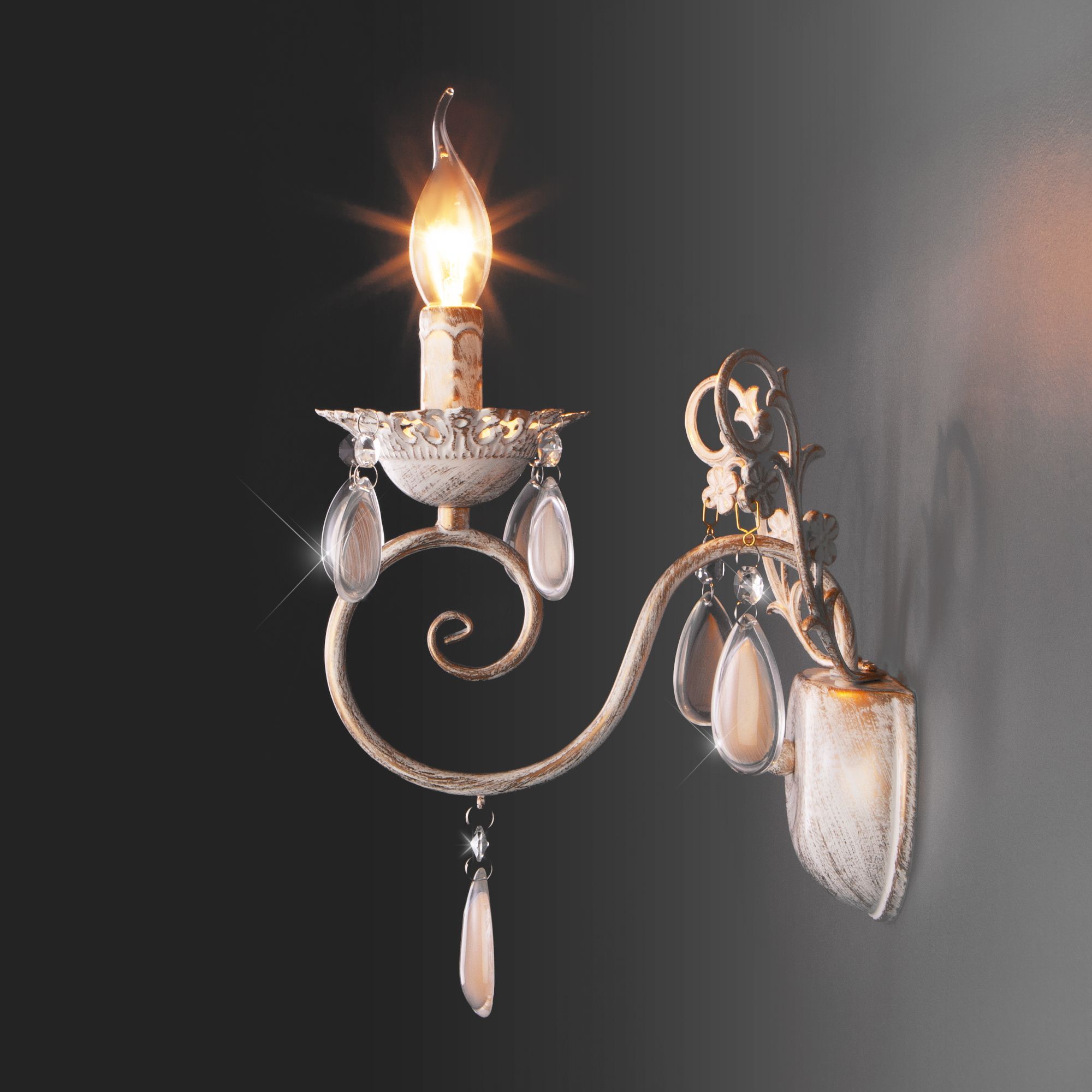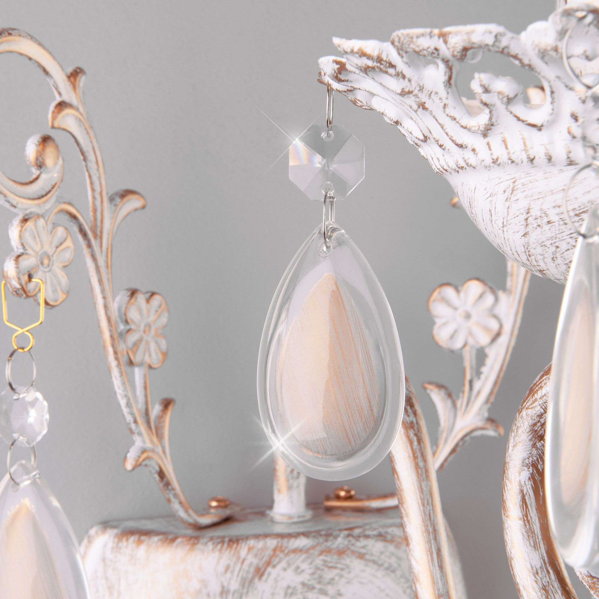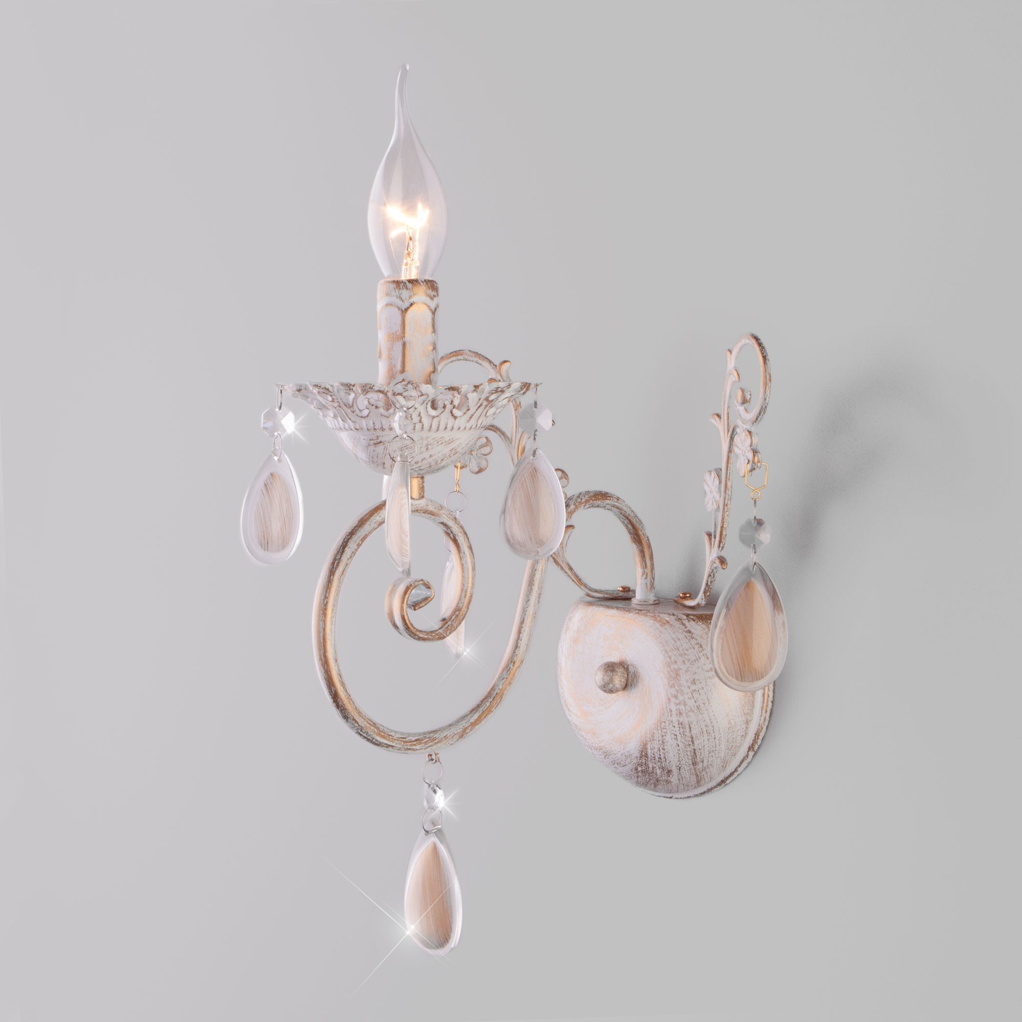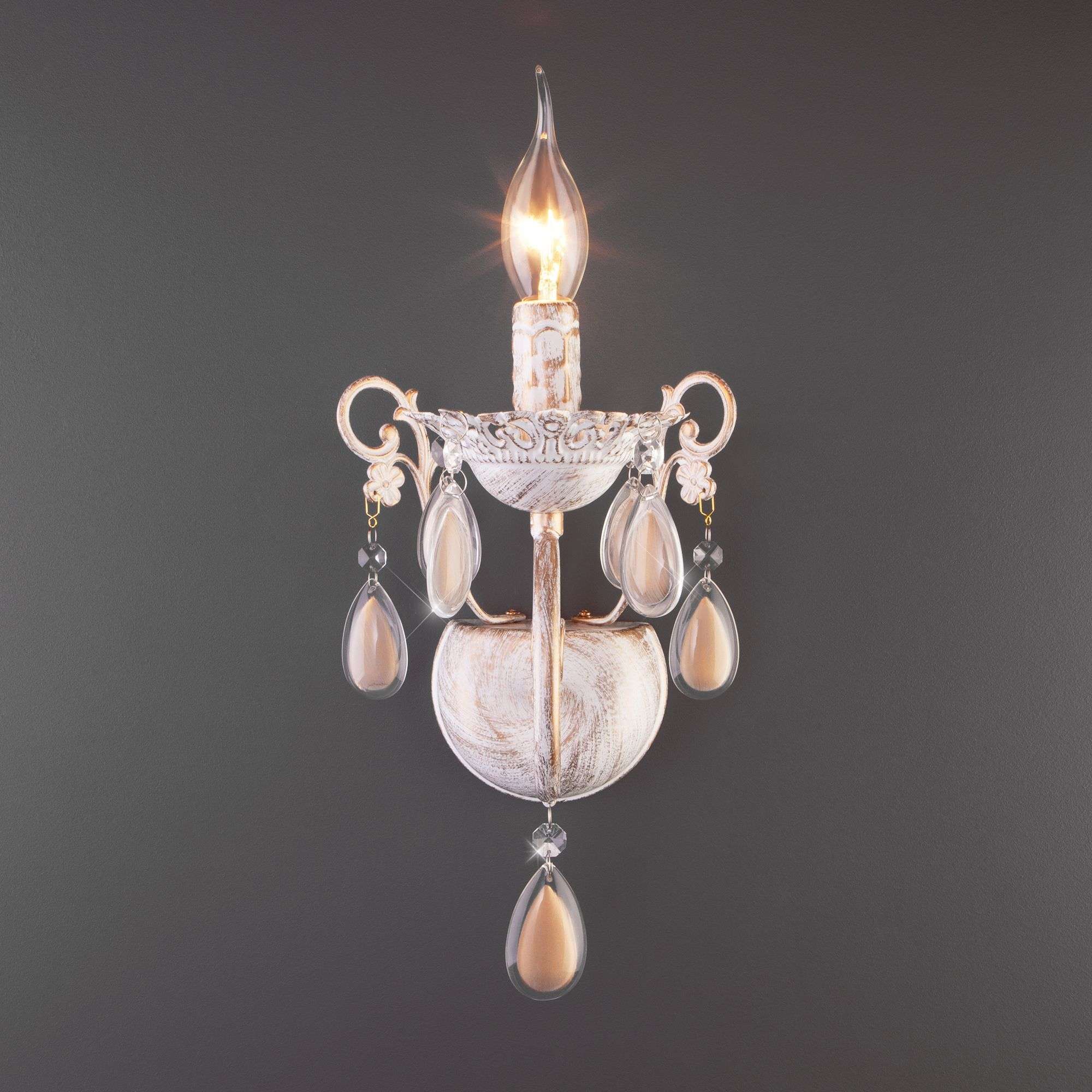 Бра классическое с хрусталем 10009/1 золото с белым станет ярким световым акцентом в классических интерьерах и создаст качественное освещение на площади 5 м². Изящные чаши подсвечников украшены хрустальными подвесками, которые искрятся в лучах света, наполняя помещение выразительным блеском. В качестве источника света используются сменные лампы типа свеча на ветру с цоколем Е14. Патрон рассчитан на максимальную мощность ламп накаливания 60 Вт.