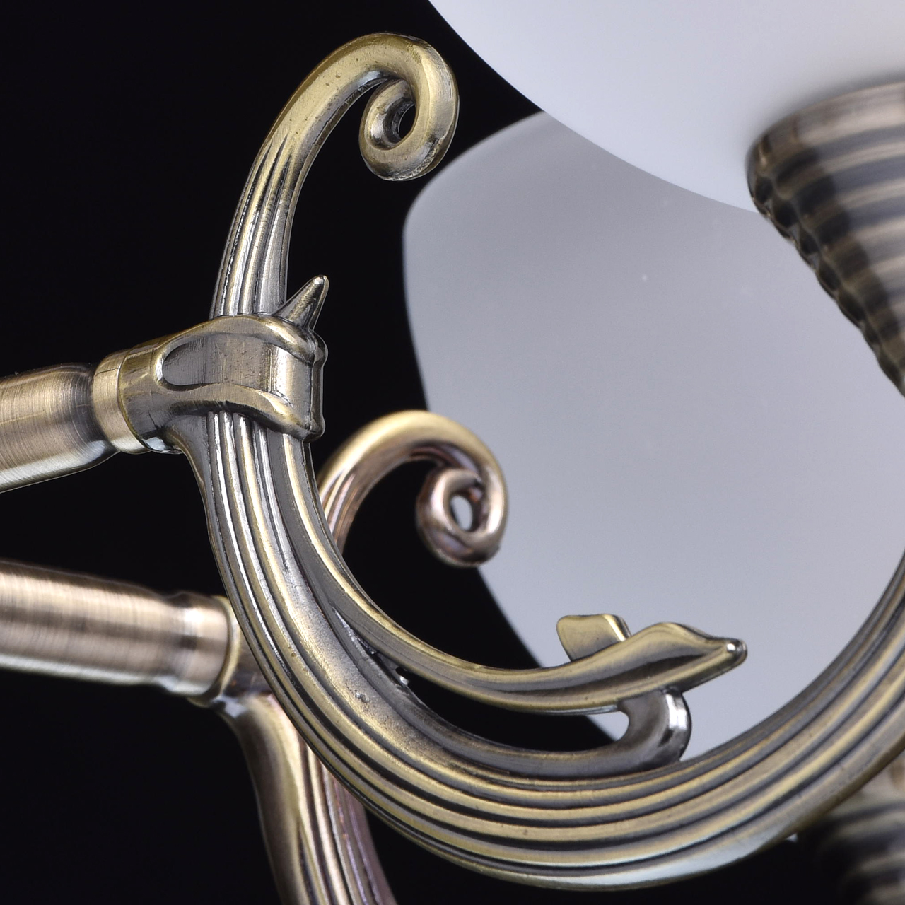 яркая цветовая гамма: белоснежные плафоны-полусферы из матового стекла контрастируют со сложным богато декорированным основанием, оформленным в цвете патинированной бронзы; лаковая поверхность делает облик люстры еще более стильным;