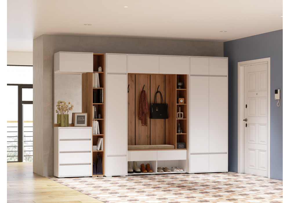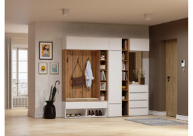 Состав комплекта: стеллаж -593722 , готовая прихожая- 593725, навесной шкаф -593731 , шкаф -593720 ,готовая прихожая -593727 , навесной шкаф -593733 , шкаф -593730.