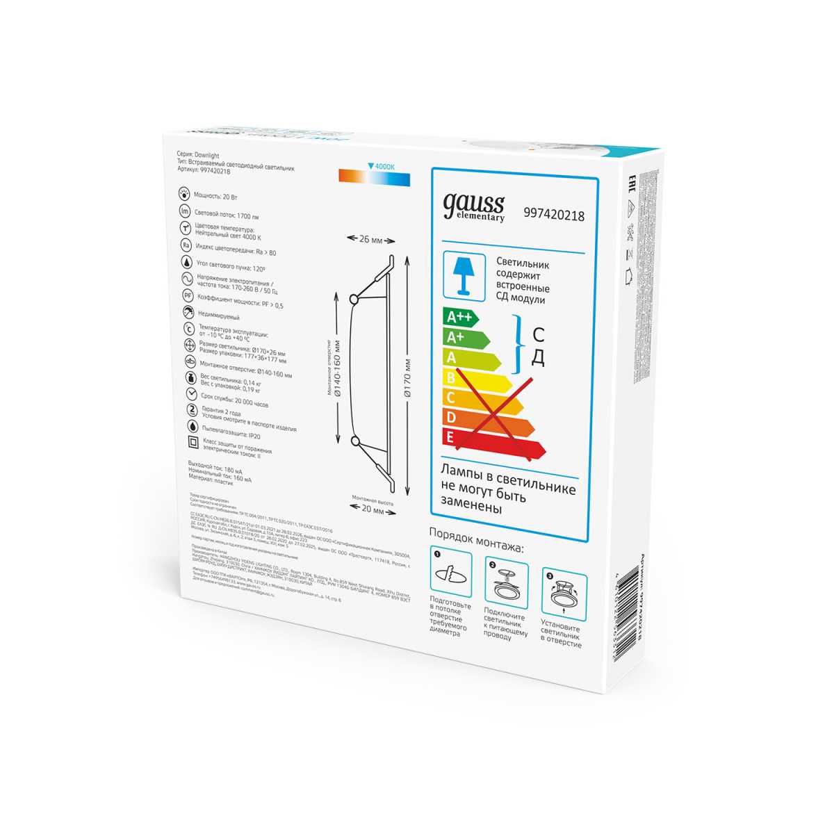 Купить "Встраиваемый светодиодный светильник Gauss Elementary Downlight 997420218"